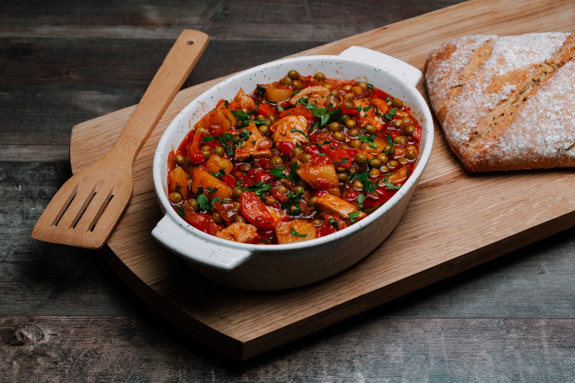 Ingrediente: carne pui/porc, mazare, cartofi, morcov